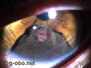 Melanoma circunscrito da porção inferior da íris, em contacto com a córnea, ricamente vascularizado, de um homem de 27 anos. |