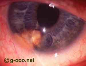 Metástase da íris de adenocarcinoma do pulmão de um homem. |