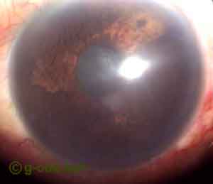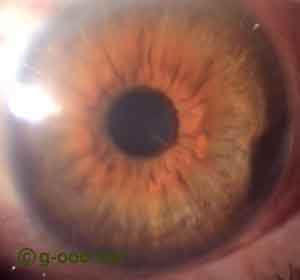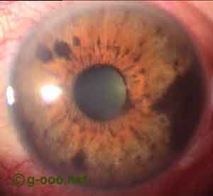 Progressão de metástase da íris, em doente com disseminação sistémica de melanoma maligno cutâneo. |