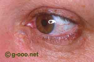 e Hidrocistoma apócrino da pálpebra inferior esquerda da mesma doente, mulher de 50 anos. |