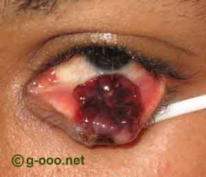 Sarcoma de Kaposi ulcerado da pálpebra numa mulher imuno-deprimida de 31 anos. |